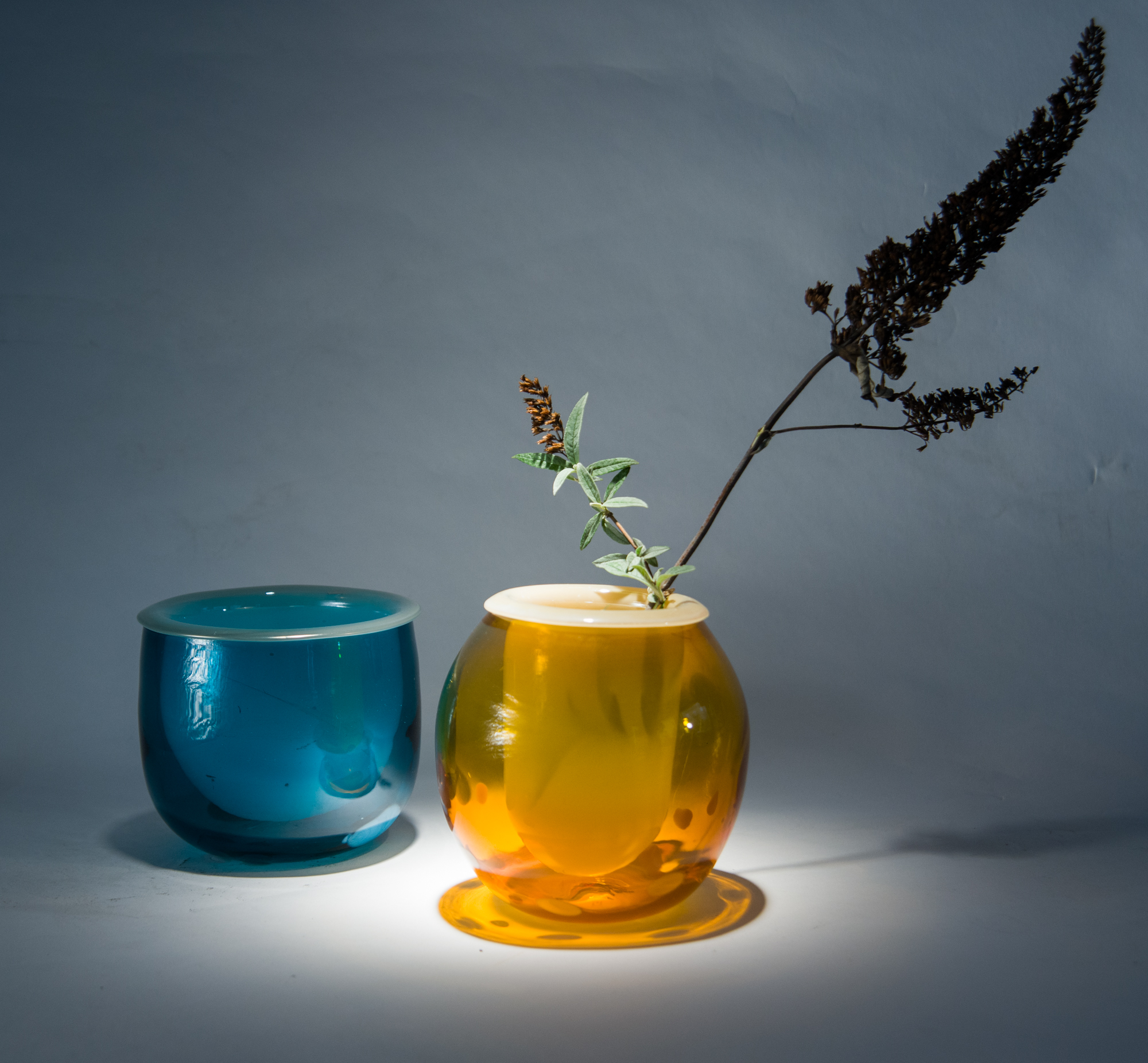 Pots de fleurs percés s’adaptant à leur cache-pots en nuances transparentes.
